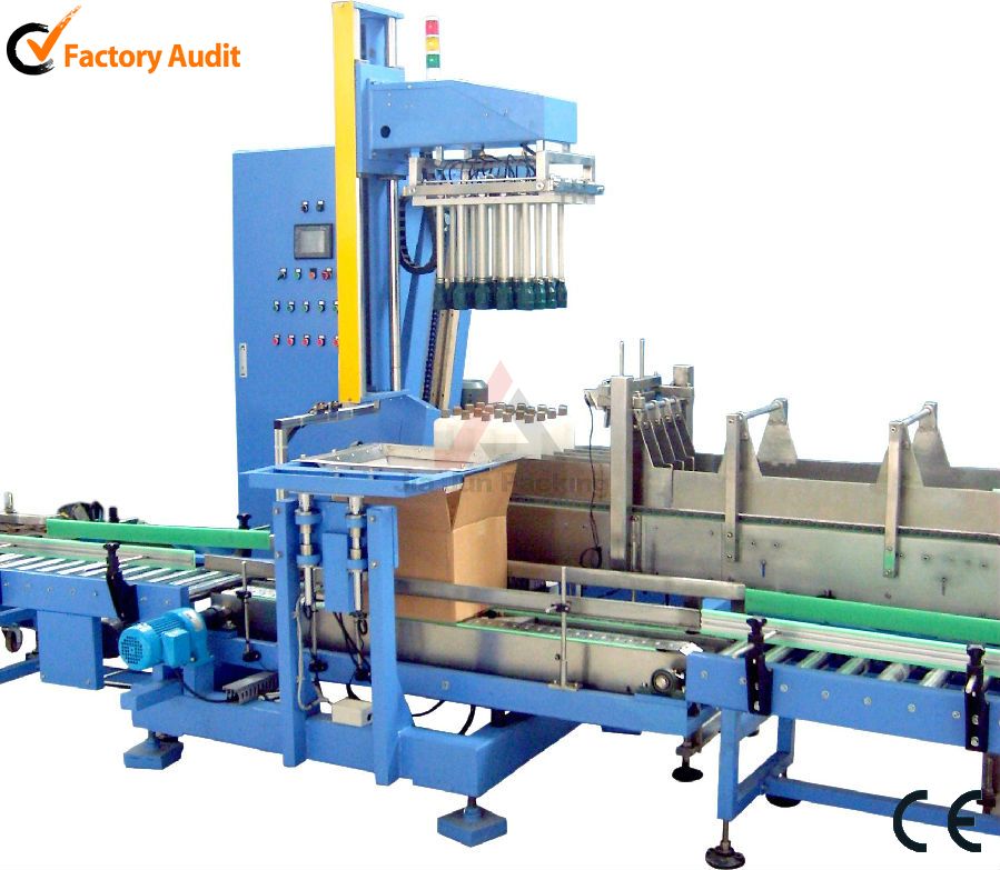 本機是一種智能性全自動裝箱機,采用高速分配裝置包裝各種容器,包裝塑料扁瓶、圓瓶、不規(guī)則形瓶,各種大小玻璃瓶,圓瓶、橢圓形瓶、方形罐及紙罐等,另外也適用于帶隔板的包裝箱。由瓶夾(內(nèi)置橡膠,以防損傷瓶體)夾住瓶體,放入打開的紙箱當(dāng)中, 當(dāng)抓頭抬起時,將紙箱排出,送至封箱機,本機采用P.L.C + 觸摸顯示屏控制。設(shè)有缺瓶報警停機,無瓶不裝箱安全裝置。大大減少生產(chǎn)人員和勞動強度,是自動化規(guī)模生產(chǎn)必不可缺少的設(shè)備。